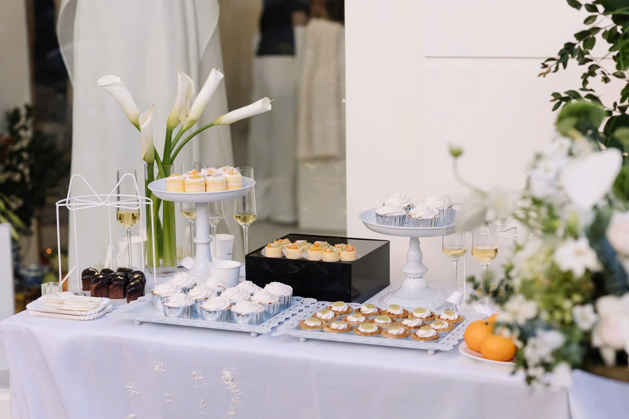 Các món bánh ngọt, trái cây tươi, trà và cà phê được trình bày trên bàn tiệc phong cách châu Âu, mang lại cảm giác sang trọng và thân thiện.
